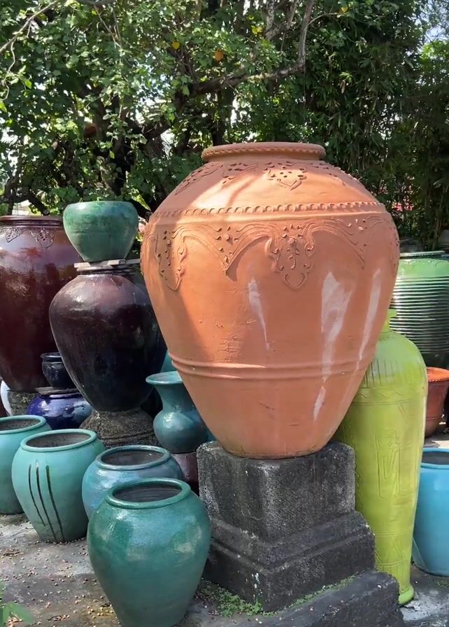 large collection of colorful clay pots in an outdoor setting, possibly a pottery yard or a retail space. The pots are of varying sizes, shapes, and glazes, ranging from large, bulbous vessels to smaller, more cylindrical containers. The colors include shades of brown, terracotta, green, blue, and black. Many of the pots are arranged on concrete bases or directly on the ground, lining a paved pathway. Lush green trees and foliage provide a backdrop to the scene, and sunlight casts shadows across the ground. The camera pans slowly, showcasing the diversity and abundance of the pottery collection. No people are visible in the video.