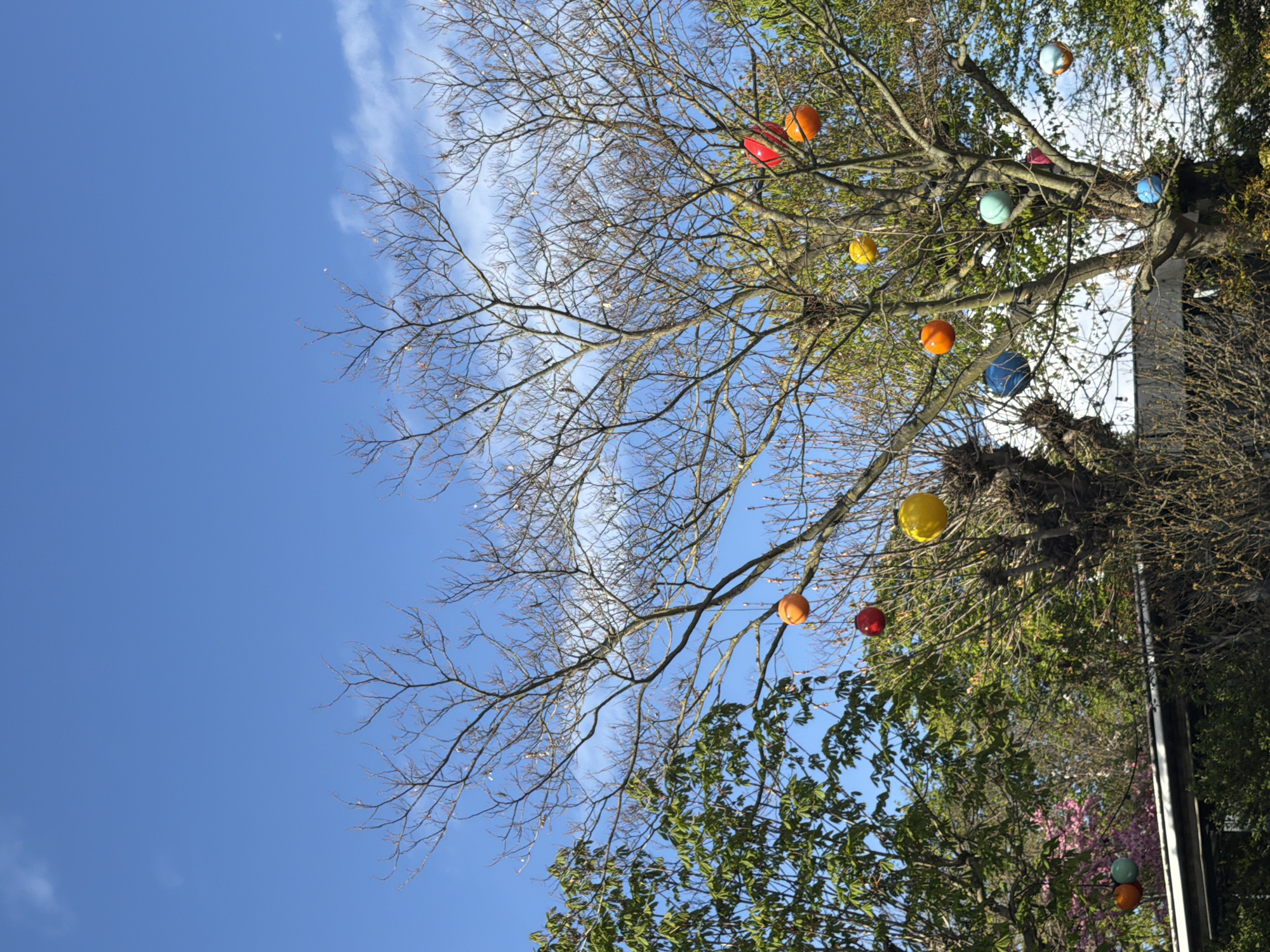 The image depicts an outdoor scene in Suresnes, France, under a clear blue sky with minimal scattered white clouds. A large, bare deciduous tree with a complex network of branches dominates the central frame, extending from the lower middle to the top. Numerous spherical decorations, approximately 10-12 in count, are suspended from various branches of this tree. These spheres are solid-colored, appearing in red, orange, yellow, dark blue, light blue/teal, and pink/magenta. To the left of the central tree, a tree with dense green foliage is visible. In the lower background, additional trees and shrubs are present, including some with visible pink blossoms. A dark horizontal structure, possibly a building's roofline or a railing, is discernible in the lower-middle section of the image. No individuals or animals are present.