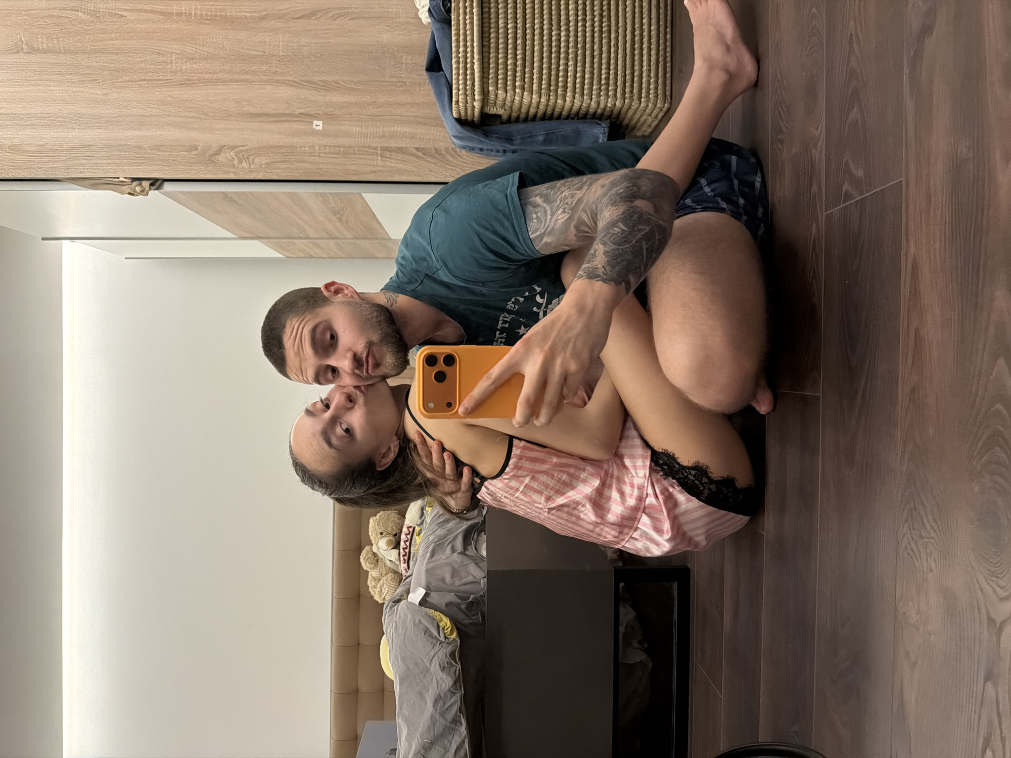 A couple is taking a selfie in what appears to be a bedroom. The man is wearing a green t-shirt and patterned shorts, with extensive tattoos on his arm. The woman is wearing pink and white striped pajamas with black lace trim. They are sitting on a wooden floor. In the background, there is a bed with a gray comforter, a bedside table, and a wooden cabinet. A wicker basket is visible in the upper right corner. The setting suggests a domestic interior, possibly in a residence. Sofia, Bulgaria is not indicated in this image.