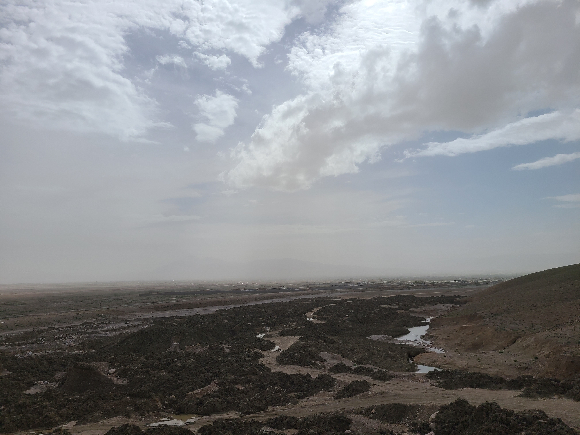 This image presents a broad, elevated view of an arid landscape located near Quetta, Pakistan. The foreground is dominated by extensively disturbed, dark brown and grey earth, sculpted into irregular mounds and depressions, suggesting excavation or significant erosion. Several small, murky puddles of standing water reflect the sky, scattered within the depressions. A winding dirt track or path is visible through this uneven terrain. To the right, a barren, light-brown hillside rises steeply, forming part of the immediate foreground. The midground transitions into a flatter, expansive stretch of light brown, dry earth, with faint horizontal lines indicating distant infrastructure or roads. In the far background, a hazy silhouette of low-lying structures, indicative of a city or settlement, is discernible against distant, light-grey mountains that fade into the atmospheric haze. The sky above is partially overcast with large, uneven grey and white cumulus clouds, allowing some patches of brighter light to break through, particularly towards the right side of the frame. No individuals, vehicles, or active discernible human interactions are present in the scene.