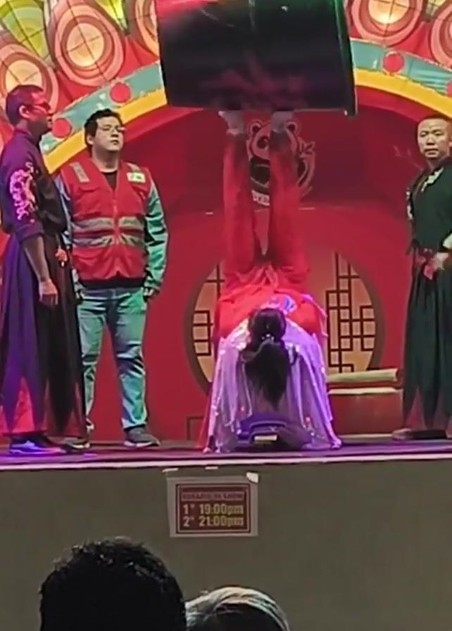 On a stage with a colorful backdrop featuring Chinese imagery, a woman dressed in red and silver performs a balancing act. She is upside down, with her feet supporting a large, dark object, possibly a container. She is surrounded by three other people. One man to the left is wearing a dark robe with decorative embroidery. Another man stands in the center in a red vest and jeans. To the right, a woman in a dark green robe observes the performance. The audience is visible in the foreground. A sign displaying showtimes is affixed to the front of the stage. The overall atmosphere suggests a cultural or theatrical event.