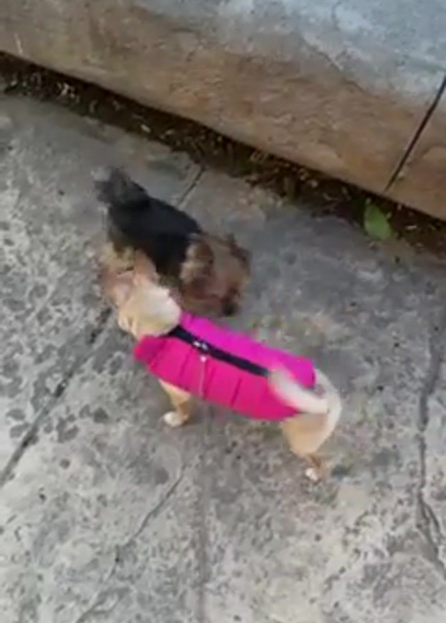 Two small dogs interact on a stone-paved surface near a concrete wall. One dog wears a bright pink jacket. The other dog is dark colored. The dogs sniff and circle each other. A pink leash is visible.