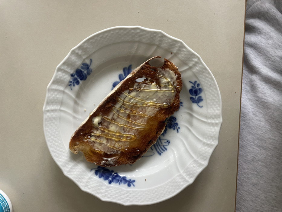The scene depicts a single slice of heavily toasted bread, possibly from a baguette, positioned centrally on a white ceramic plate. The toast is covered with a light-colored, creamy substance, and drizzled with a viscous, amber-hued liquid, consistent with honey or syrup, forming parallel lines across its surface. The plate features a decorative scalloped edge, a textured relief pattern, and blue floral motifs characteristic of Royal Copenhagen porcelain. The plate rests on a smooth, light beige surface, likely a tabletop. In the upper left portion of the image, a segment of a white plastic bottle with blue text is visible, bearing the Danish phrase "omega-3 fiskeolie" (omega-3 fish oil). The lower foreground reveals a textured, light grey fabric, suggesting a casual indoor setting, possibly a bed or sofa. Based on the Danish language on the bottle and the distinct style of the plate, the location is inferred to be in Copenhagen, Denmark.