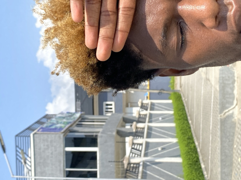 This image captures an outdoor daytime scene in Alaguntan, Nigeria. The foreground on the right displays the partial head and face of an individual with dark skin, facing towards the left. Their left eye is closed or squinting, and their right hand, with fingers slightly splayed, covers part of their forehead and the front of their hair, obscuring their right eye, likely to block sunlight. The hair is dark at the roots and transitions to tightly curled, light brown or blonde tips. The skin reflects strong sunlight, appearing glossy. In the midground and background, an urban environment is visible under a clear blue sky with scattered white clouds. A prominent multi-story building with a grey facade and large rectangular glass windows occupies the left side. It features a flat roof with a dark railing and a blurred blue and green sign attached to its upper section. A paved pathway, light in color with visible horizontal sections or markings, recedes into the distance. This pathway is bordered on its left by a grey fence with decorative horizontal and diagonal patterns, topped with light-colored finials. A continuous line of green, manicured bushes runs along the base of the fence adjacent to the pathway. A dark-colored building with smaller windows is partially visible behind the fence, further in the background. A single streetlight extends from the upper left corner of the frame.