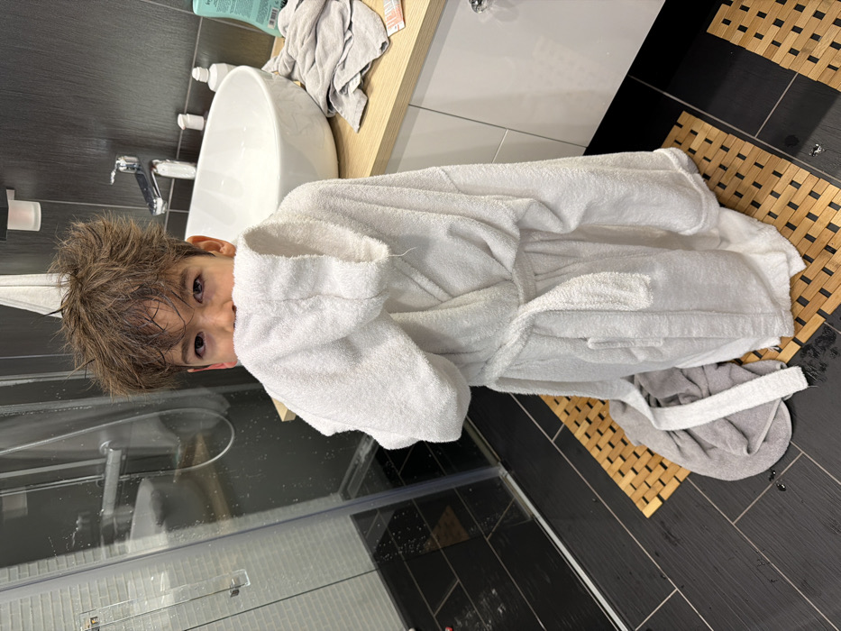 A child with wet, spiky hair peeks from a white bathrobe, standing in a bathroom