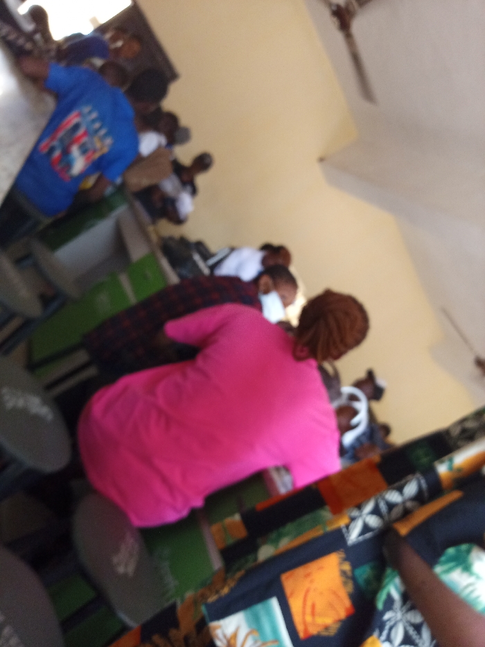 A classroom scene shows students seated at desks. One student wears a blue shirt with graphics. Another wears a bright pink shirt. Masks are visible on some faces. The desks are primarily green and white. The room has light yellow walls. A ceiling fan is visible. A colorful patterned cloth is in the foreground, possibly on a desk or person. The photo appears to be taken at an angle, blurring the background details.