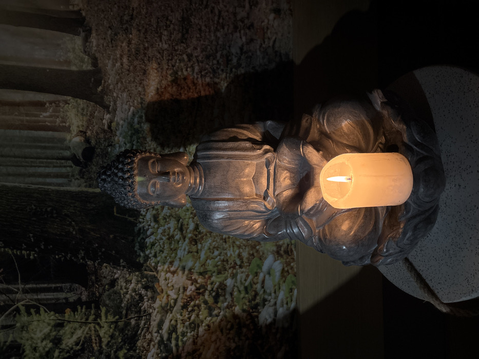 The image displays an indoor scene in Баня, Bulgaria. A dark grey, seated Buddha statue occupies the central foreground, rendered in a meditative posture with closed eyes and hands joined in Dhyana Mudra, resting on its lap. A thick, off-white pillar candle, actively burning with an orange flame, is positioned directly within the Buddha's cupped hands, serving as the primary light source. The candle's light illuminates the lower portion of the statue and casts a warm glow upwards onto its torso and face. The statue rests on a circular, light-colored, speckled base, from which a braided rope or cord descends on the left side. The background consists of a wall mural or wallpaper depicting a dense forest with numerous dark tree trunks and a forest floor covered in green vegetation, possibly frosted or lightly snow-dusted, under dim lighting conditions. No individuals are present in the scene.