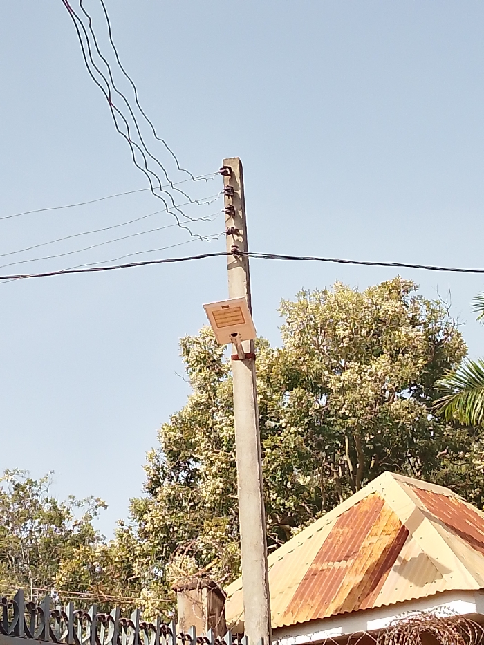 Location: Unknown, Unknown. The image depicts an outdoor scene dominated by a concrete utility pole positioned centrally against a clear, light blue sky. Five visible electrical wires, exhibiting some slack and wave-like patterns, are horizontally strung across the upper portion of the frame, attached to the pole via brown insulators. Below these wires, a white rectangular solar-powered LED streetlight is mounted to the pole, angled slightly downward. To the right of the utility pole and extending into the background, dense green foliage from trees is visible. The tip of a palm frond is present in the upper right corner. In the lower right quadrant, the multi-pitched, corrugated metal roof of a building is visible, displaying significant rust and weathering with colors ranging from pale yellow to orange-brown. The top of a dark-colored metal fence or gate with ornate scrollwork is visible along the bottom left edge of the frame. Immediately behind this fence, a concrete pillar or wall section, topped with coiled razor wire, is present. No people are visible in the scene. The lighting suggests bright daylight conditions.