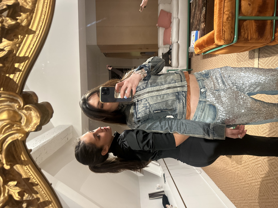 Two women stand in front of an ornate, gold-framed mirror, captured in its reflection. The woman on the right, holding a phone, wears a denim jacket over a midriff-baring top and shiny, silver pants. The other woman, closer to the bottom of the frame, is in a black top and leggings, with her hair pulled back in a ponytail. The reflection also reveals part of a living room setting with a white sofa, a brown armchair, and a patterned rug.