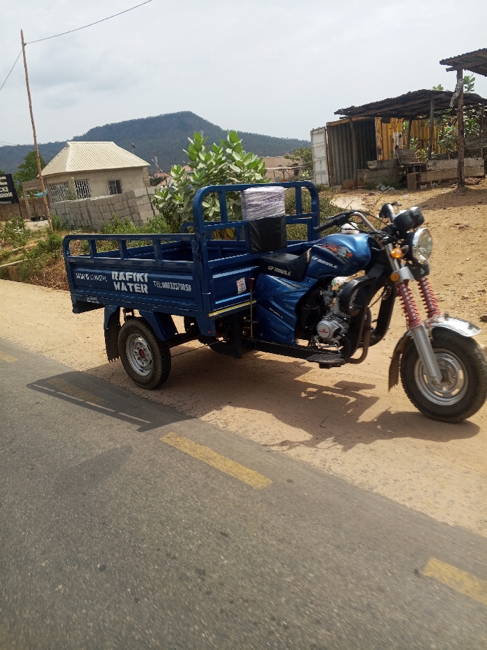 - "The scene depicts a blue three-wheeled motorcycle with a cargo bed, parked on a dirt shoulder adjacent to an asphalt road in Adankolo, Nigeria" by FM-IRx8d2, licensed under CC BY 4.0