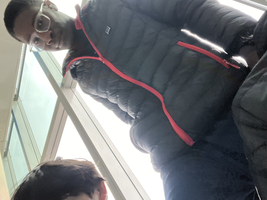 The image depicts two individuals inside the European Parliament building (Louise Weiss Building) in Strasbourg, France. The scene is illuminated by bright natural light filtering through large, angled glass panels and skylights forming part of the modern, structural ceiling. In the foreground, occupying the central and right portions of the frame, is a male individual with dark skin, short dark hair, and clear-framed glasses. He wears a black puffer jacket featuring prominent red zippers for the main closure and pockets. A small, illuminated square icon, resembling a heating indicator, is visible on the upper left chest area of his jacket. He is looking directly at the camera with a neutral expression. Dark trousers are partially visible below his jacket. On the far upper-left, the top of a second individual's head, showing dark, medium-length hair, is visible. This person is positioned very close to the camera, suggesting a selfie perspective or close interaction. The overall composition is a low-angle shot looking upwards towards the individuals and the illuminated ceiling structure.