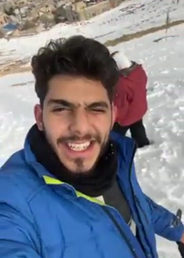 A young man with a beard and braces is smiling and taking a selfie video. He is wearing a blue jacket and a black scarf. In the background, there is a snowy landscape with a few people. Some of the people are bending over and gathering snow. There are buildings visible in the far background, and a few small trees scattered around the snowy area. The sky is overcast.