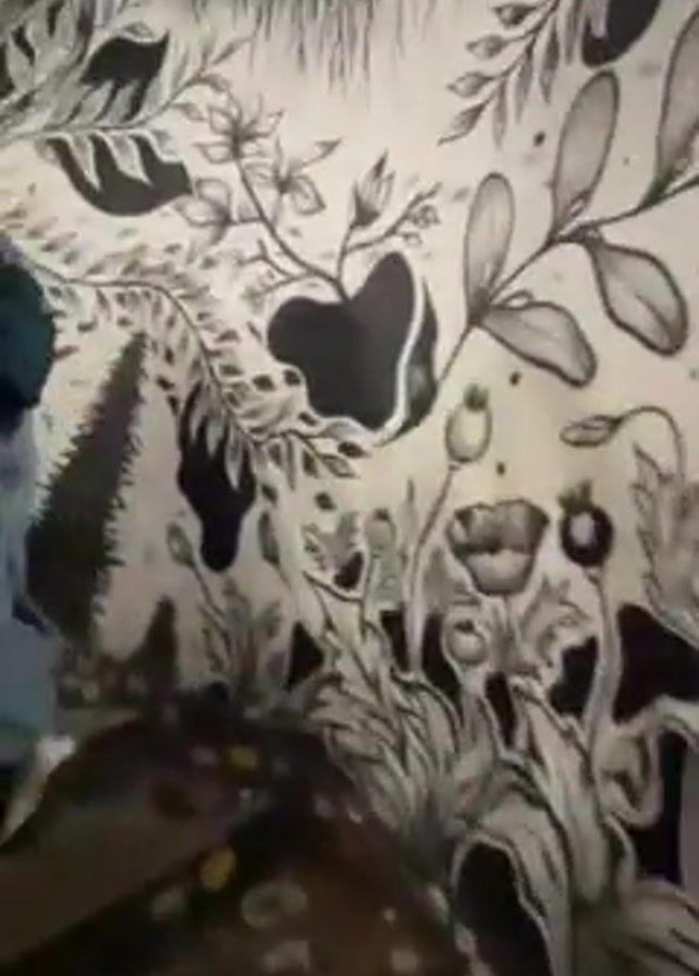 A person in a blue shirt and backpack walks up a short set of stairs. The wall to the right of the stairs is covered in a black and white drawing of trees, flowers, and other foliage. The stairs have a colorful, striped pattern. The person disappears through a dark doorway at the top of the stairs.