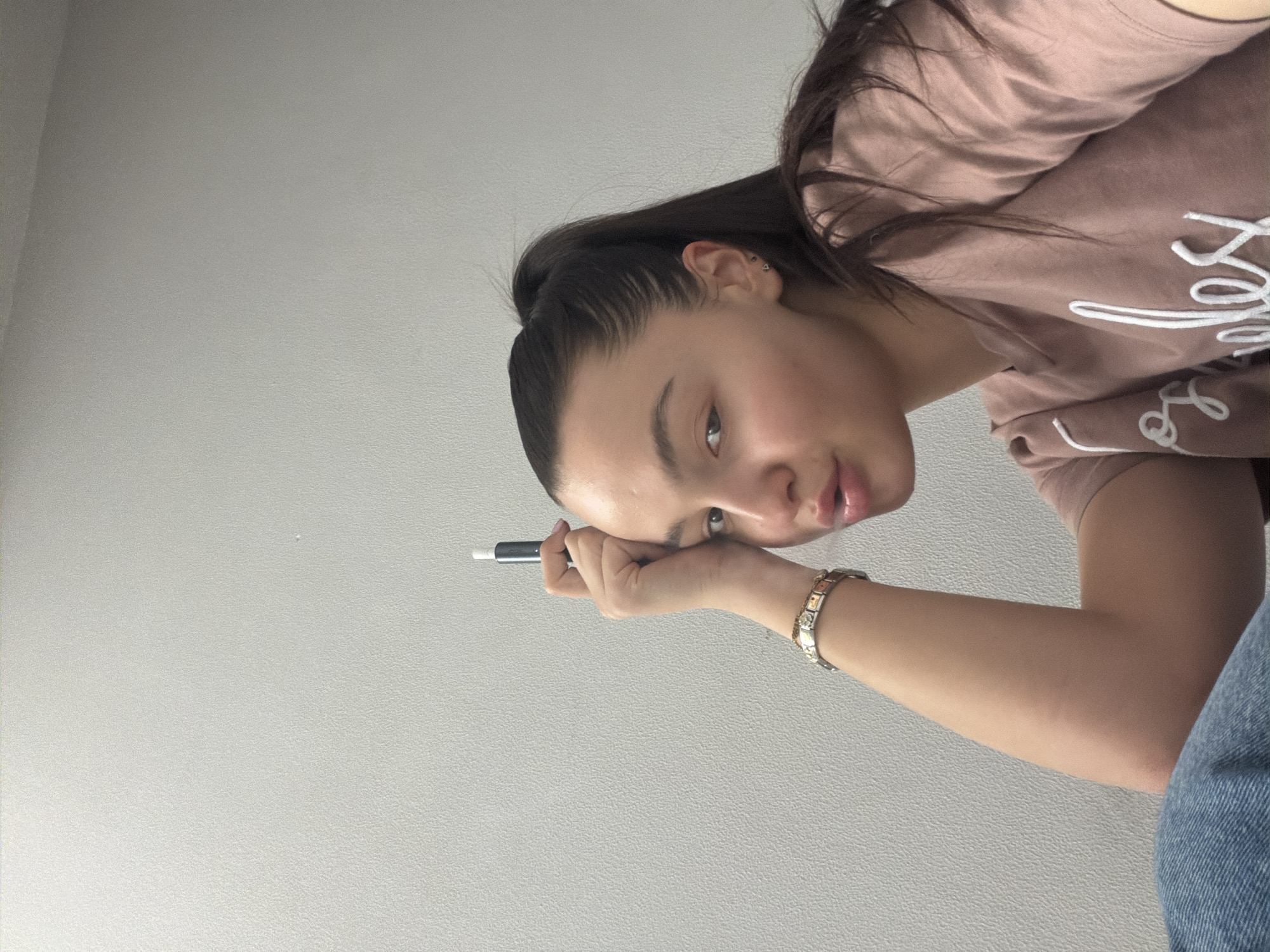 A young woman poses in front of a light gray wall. She holds a black pen near her face with her right hand. The woman has dark hair pulled back into a high ponytail and wears a pale pink top with white lettering on the front. She also wears a gold bracelet on her right wrist. Part of a blue denim garment is visible at the lower right corner of the image. The location and other details are not provided.