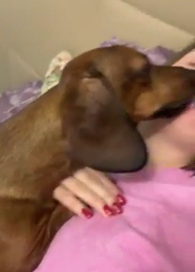 A brown dachshund is licking the face of a woman lying in bed. The woman is wearing a pink shirt and has red nail polish on her fingers. The bed has a purple and white floral patterned sheet and is next to a beige headboard.