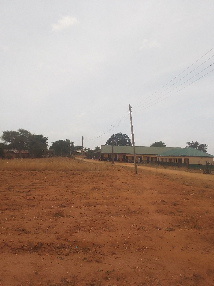 dirt road leading to a building in the distance. The building is a school, with a green roof and beige walls. There are people walking on the road in front of the school, but they are not identifiable due to distance and pixelation. The sky is overcast and the ground is dry and red. The environment is rural and the area is sparsely populated. The image was taken in Kwal, Nigeria, at the coordinates 9.804 latitude, 8.648 longitude. The scene is quiet and there is no sign of any activity. There are three wooden utility poles with electrical wires running across the image, which ends on the building.