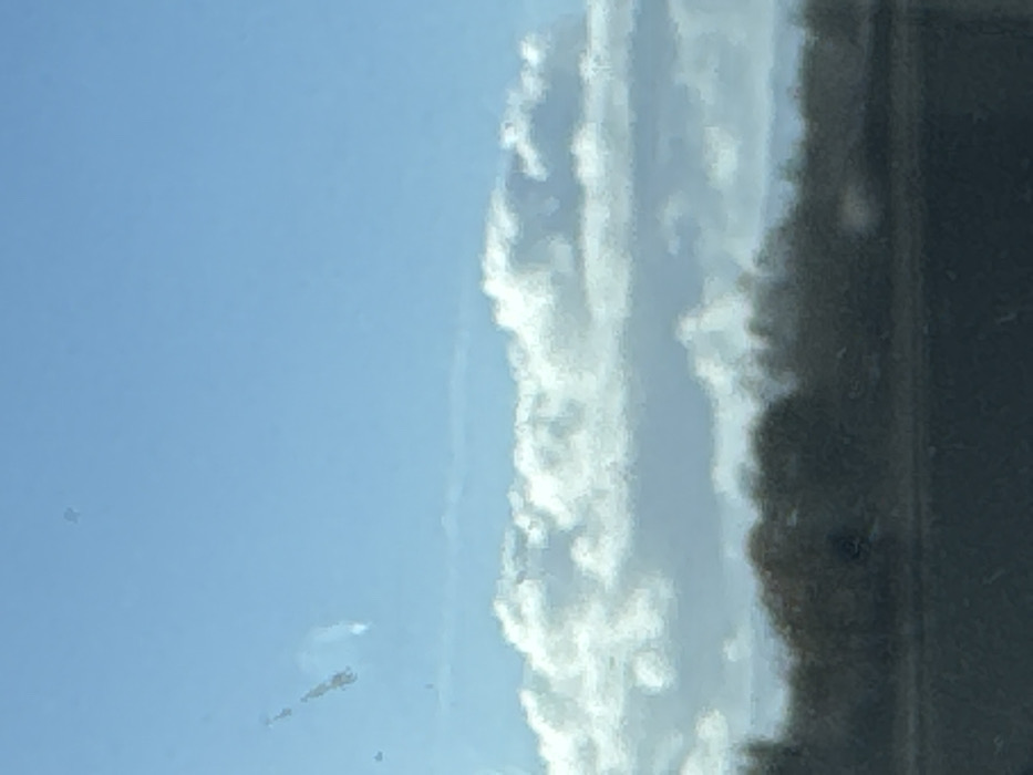 The image displays a daytime outdoor scene in Illkirch-Graffenstaden, France, captured through a transparent surface exhibiting multiple artifacts. The upper three-quarters of the frame features a bright, clear blue sky. A prominent horizontal band of white and light grey cumulus clouds extends across the mid-frame. Numerous dark specks and streaks, consistent with surface contaminants such as dirt or moisture, are visible in the upper left quadrant. The lower quarter of the image consists of a blurred, dark horizontal band suggesting a distant tree line or dense foliage, rendered in muted greens and browns. The very bottom of the frame shows a darker, indistinct horizontal plane. No individuals, identifiable man-made structures, or discernible actions are present within the scene.