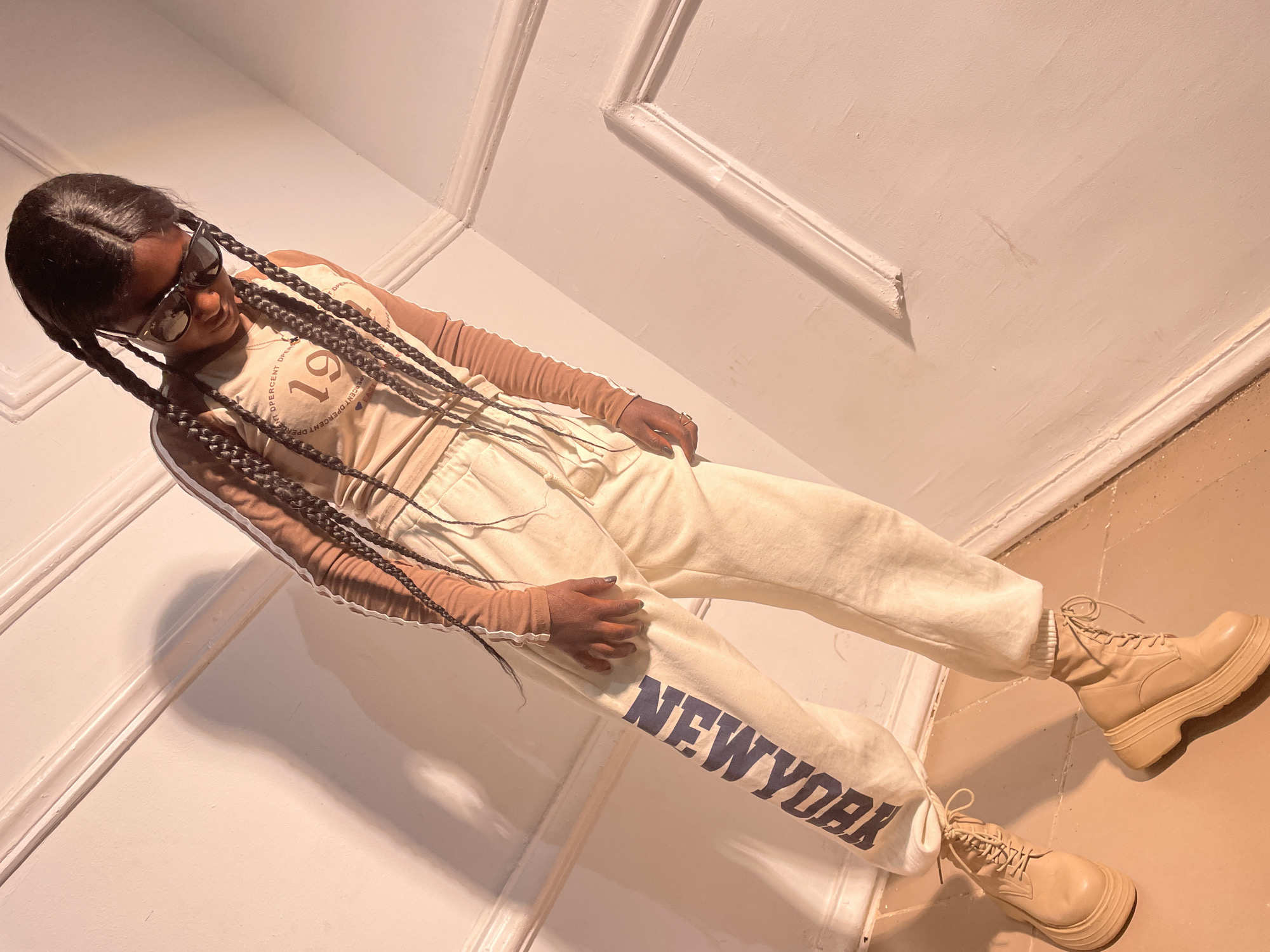 The scene depicts an individual standing indoors within a structure identified as being in Barakin Akawo, Nigeria. The subject is a dark-skinned individual with long, dark braided hair, wearing dark sunglasses that obscure the eyes, and a small pendant necklace. Attire consists of a light tan long-sleeve top featuring brown sleeves with white stripes and a circular graphic on the chest displaying "OPERCENT OPERCENT" and a large "19". The individual wears light beige sweatpants with "NEW YORK" printed vertically in dark blue on the left leg. Light tan platform lace-up boots are worn on the feet. The individual's head is tilted downwards, and the left hand, adorned with a ring on the fourth finger, rests near the left hip. The background features a light-colored wall with white decorative molding, including a horizontal rail and corner trim. The floor is tiled in a light brown or tan hue. Strong, warm-toned light originates from the right, casting distinct shadows of the individual on the wall.
