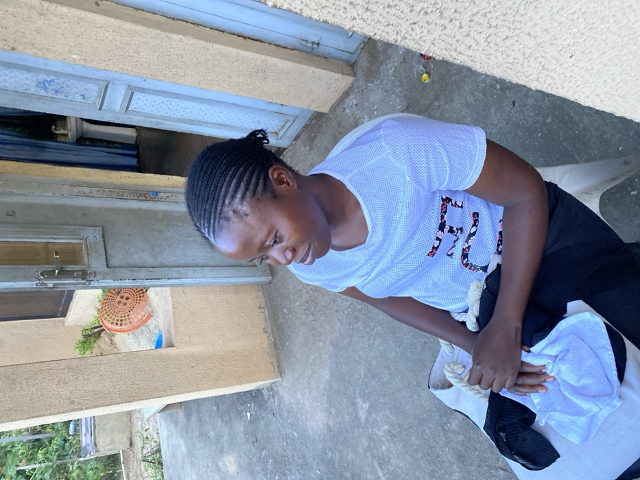 A woman sits outside on a white plastic chair, gazing downward at her hands. She wears a white t-shirt with a floral design and black pants. Her hair is braided and pulled back into a small ponytail. Her hands rest on top of a white towel, which sits on a light-colored bag or tote. Behind her, a weathered doorframe is visible, along with a textured beige wall. The scene appears to be outdoors, near an entrance.