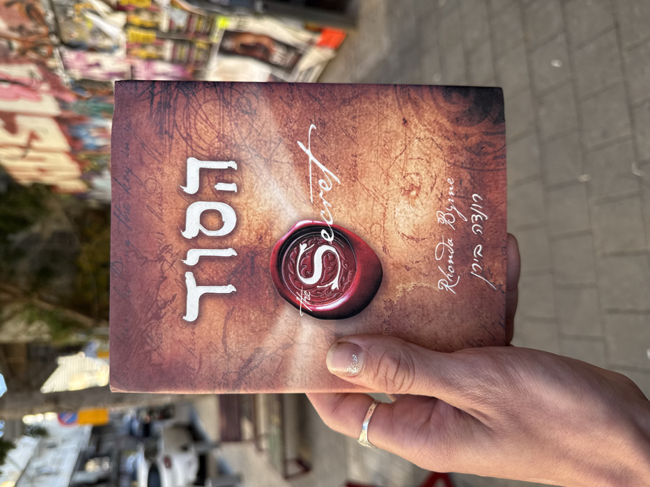 A close-up, eye-level photograph shows a person's right hand holding a copy of Rhonda Byrne's book, "The Secret" (הסוד, in Hebrew), outdoors in Tel-Aviv, Israel