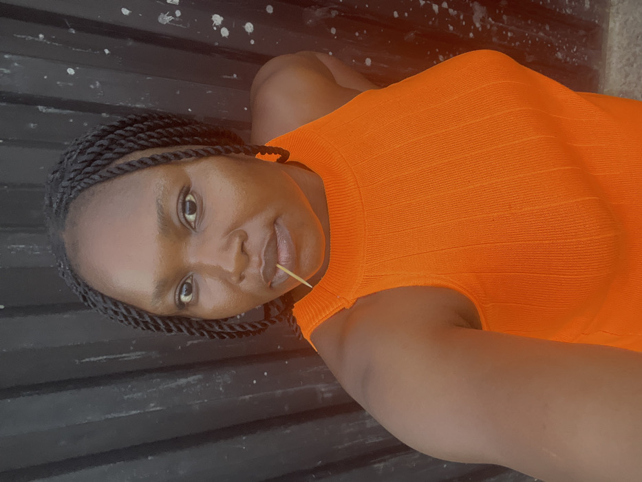 A close-up portrait shows a female individual in the city of Ado, Nigeria, looking directly at the camera. She has a dark complexion and dark hair styled in braids. A light-colored toothpick is held horizontally between her lips. She is wearing a bright orange, ribbed, sleeveless top with a high neckline. The background consists of a dark, vertically textured surface, possibly corrugated metal, with scattered white marks or splatters. The lighting is direct, illuminating the subject's face and upper torso.