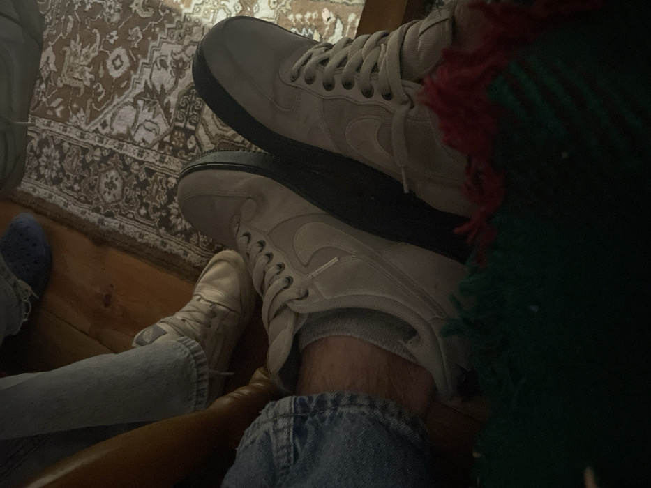 The image displays a low-angle view of multiple individuals' lower extremities within an indoor setting in Chernomorets, Bulgaria. In the foreground, a person is seen wearing light blue denim jeans, grey ankle socks, and light grey low-top sneakers with black soles. The lower portion of this person's legs and feet are partially covered by a dark green woven fabric with red fringed edges. To the left, another individual wears light-wash jeans and white high-top sneakers. In the background, a blue, perforated clog-style shoe (likely a Croc) is visible. The floor consists of light brown wooden planks partially covered by an ornate patterned rug featuring shades of brown, beige, and dark grey. The lighting is dim, suggesting an evening or low-light interior environment. No specific actions or interactions between individuals are discernible, but their proximity indicates a shared space.