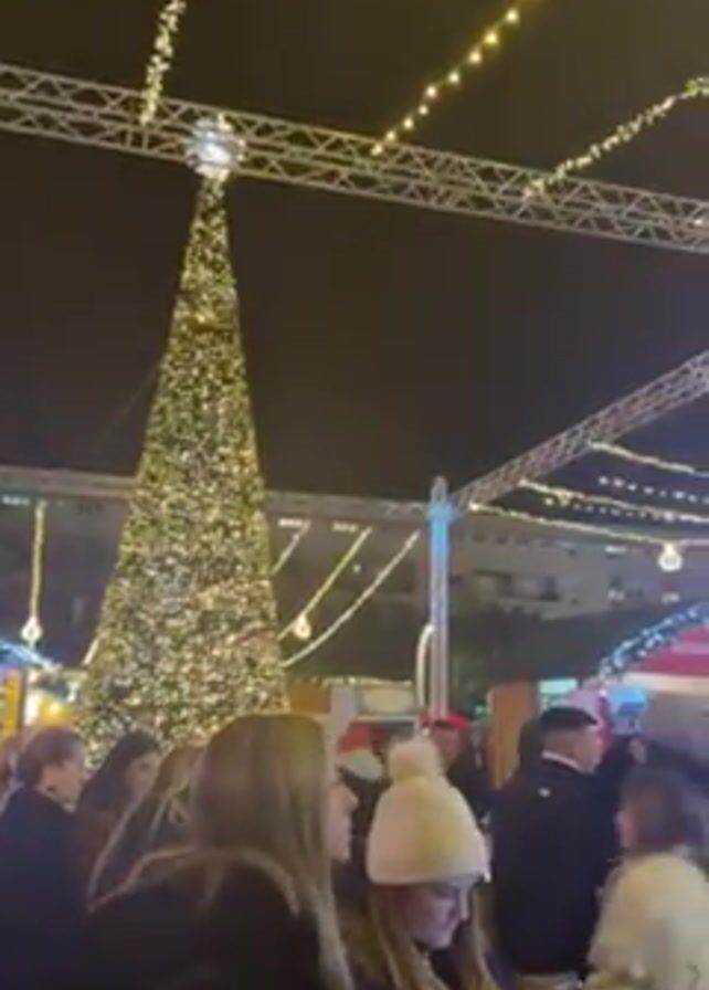 The video captures a bustling scene at what appears to be an outdoor Christmas market or festival at night. A tall, brightly lit Christmas tree stands as a focal point, surrounded by a crowd of people. Many are dressed in winter clothing, including hats and coats. Some individuals are looking at their phones. Above the crowd, strings of festive lights hang from metal beams, adding to the celebratory atmosphere. In the distance, there is a stage with what appears to be a performance or display taking place. The environment is lit up with various lights, and the overall atmosphere is lively and festive.