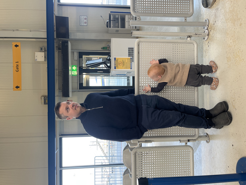 The image depicts an indoor scene within an airport gate area, specifically Gate 1, at what is likely Frankfurt-Hahn Airport in Lautzenhausen, Germany. An adult male, approximately 30-40 years old, with short dark hair and light grey temples, stands behind a perforated light grey metal barrier. He is wearing a dark blue quarter-zip sweater, dark blue trousers, and dark grey low-cut boots. His left hand is in his pocket, and his gaze is directed towards the right of the frame. To his right, an infant or toddler stands facing away from the camera, also behind the barrier. This child has reddish-blonde hair and wears a dark long-sleeved top, dark trousers, a light brown sleeveless vest, and patterned soft-soled shoes. Both of the child's hands are raised and placed on the top edge of the metal barrier. In the background, large windows to the left reveal an outdoor airfield with metal structures. To the right, a white wall features a yellow overhead sign with black arrows and text reading "Gate 1". Below this, a glass door with a green emergency exit sign above it is visible. Adjacent to the door is a white self-service kiosk with a black monitor and scanner on top. A yellow and white poster on the kiosk partially reads "HOT DRINKS", "Attention Passengers", and "RYANAIR GROUP". Various wall-mounted fixtures, including electrical boxes and vents, are present. Further to the right, a small desk with a microphone and paper holder is seen, along with two "No Smoking" and "No Vaping" circular signs on the wall. The floor is a light, neutral color.