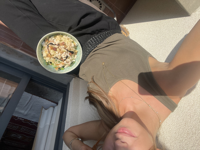 An image taken in Aldoar, Foz do Douro e Nevogilde, Portugal, depicts a female subject seated outdoors on a balcony or terrace. The subject is partially visible, primarily from the chest to the lap. She wears a khaki green ribbed tank top, black trousers with a dark patterned waistband, two layered gold necklaces (one with spaced clear stones, one with a small pendant), and a silver-toned bracelet on her raised left wrist. Her face is partially obscured by bright sunlight, exhibiting a faint smile. Resting on her lap is a light green ceramic bowl containing a meal composed primarily of a grain base, possibly couscous or rice, topped with shredded orange vegetables, green leafy components, nuts (identifiable as almonds), and two distinct sauces, one dark (resembling balsamic glaze) and one lighter, creamy sauce. To the subject's left is a light-colored, textured wall illuminated by direct sunlight, casting pronounced shadows from her body. To her right, a dark-framed sliding glass door reveals an interior space, where a patterned red and black rug and white curtains are visible through the glass. The outdoor floor beneath the subject's lap is partially visible, displaying terracotta-colored tiles. The scene is brightly lit by natural sunlight, creating strong contrasts.