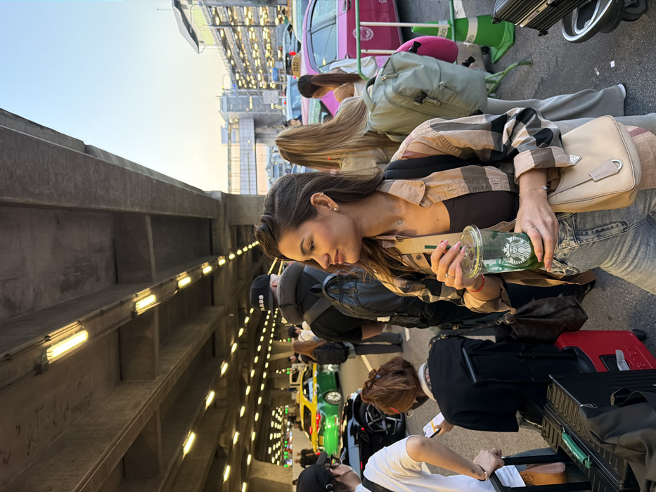 The scene depicts a busy, outdoor, covered transportation area, characteristic of a major airport or transit hub in Thailand, specified to be within Nong Prue Subdistrict. The time appears to be late afternoon or early evening, evidenced by the ambient light in the sky transitioning from blue to a soft orange, complemented by activated artificial fluorescent lighting mounted on the underside of a large, grey concrete elevated structure that provides overhead cover. In the foreground, slightly right of center, a female individual with dark, styled hair looks towards the right side of the frame with a faint smile. She wears a beige, brown, and black plaid long-sleeved shirt over a dark top, light blue jeans, and a light beige Prada shoulder bag. Her left hand holds a clear plastic Starbucks cup containing a green beverage with ice and a green straw. She wears a silver ring on her left ring finger, small stud earrings, and a silver necklace with a heart-shaped pendant. To the immediate left of the main subject, a person with reddish-brown hair, wearing a black top, is seated on a red rolling suitcase, looking down at a mobile phone. Another black bag rests on top of the red suitcase. Further back, various individuals are present, including a person with long blonde hair carrying a light green backpack, and a male wearing a black baseball cap with "MABS" on it, a dark jacket, a black backpack, and a neck pillow. Multiple other pedestrians are visible moving or waiting in the background. The background features an active roadway with several vehicles. Notably, a bright green and yellow taxi, a common type in Thailand, is prominently visible on the left, alongside a partially visible black vehicle. On the right side of the frame, multiple pink taxis are parked or in traffic. Green and white traffic cones or barriers are visible on the far right. A multi-story building, possibly a parking garage or part of the terminal, is discernible in the distant right background, connected by an elevated walkway or bridge structure. The ground surface is paved.