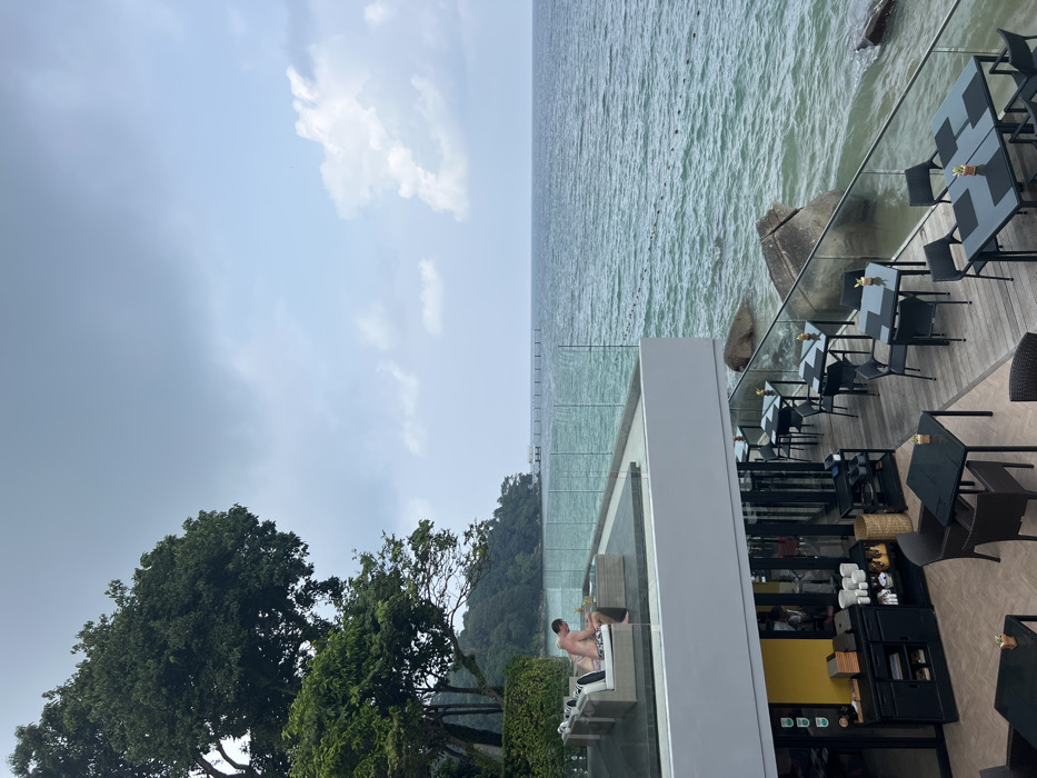 A sideways view shows a restaurant or bar overlooking the ocean. Tables and chairs are arranged on a wooden deck. A person is relaxing on a lounge chair in a glass-enclosed area, seemingly enjoying the view. Lush green trees are visible on the left, providing a contrast to the blue-gray ocean and sky. The overall scene evokes a sense of relaxation and luxury.