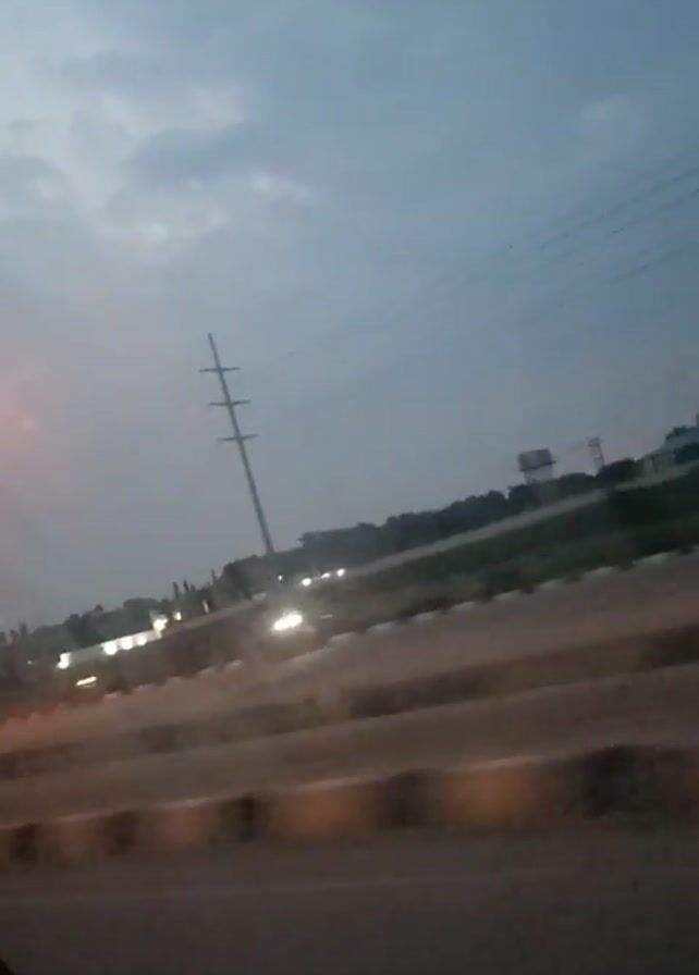 The video depicts a view from a moving vehicle, likely a car, at dusk or early evening