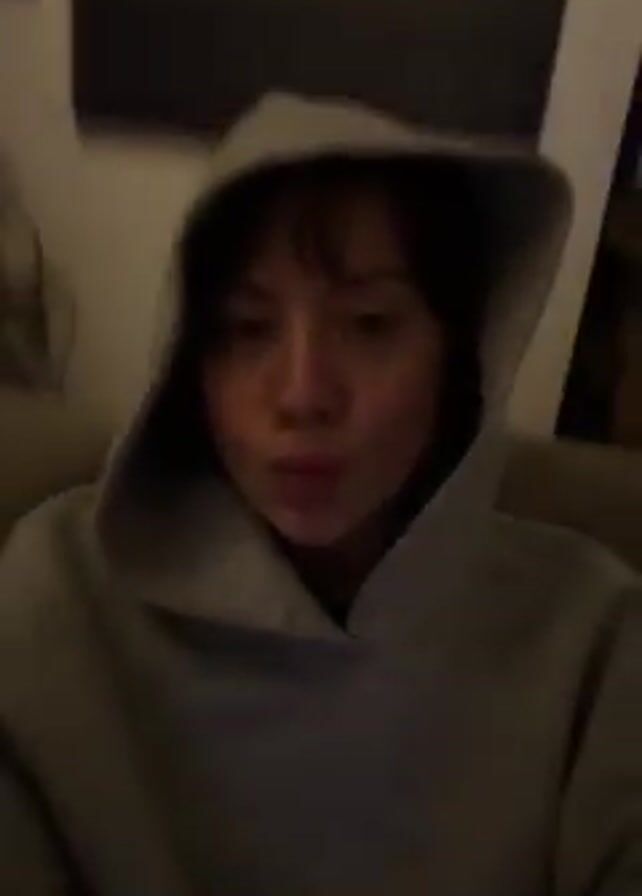 A close-up video shows a person wearing a gray hooded sweatshirt. The person has dark hair with bangs and fair skin. At the start, the person puckers their lips. Next, the person raises a hand and puts it to the side of their face, and puckers their lips again. Finally, the person zooms in close to the camera and puckers their lips. The video is shot indoors, and the lighting is dim. There is a glimpse of furniture and a wall with a switch plate in the background.