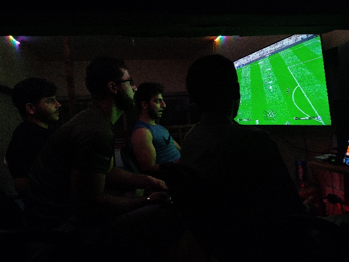 Four adult males are depicted in a dimly lit indoor setting within Sarouja Municipality, Syria, observing a football (soccer) video game displayed on a large screen