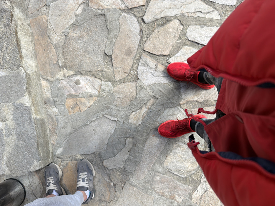 The image presents a top-down view of two individuals' lower extremities on a stone-paved surface in the city of Lyuben Karavelovo, Bulgaria. In the foreground, a person is observed wearing bright red athletic shoes, black socks, and light-colored pants. A red jacket, open at the front, covers the lower portion of the frame, revealing its inner lining. To the upper left, the feet of a second person are visible, wearing grey athletic shoes with white laces and white socks, paired with light grey trousers. The ground consists of irregularly shaped flagstones in various shades of grey and tan, interconnected by mortar. No further individuals or objects are discernible in the scene.