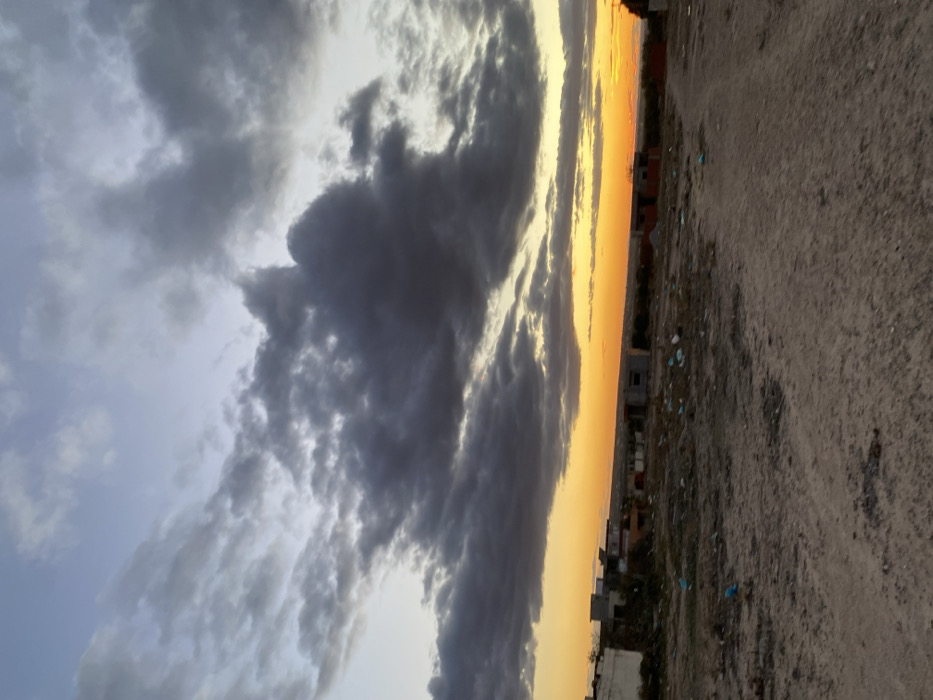 A dramatic sky dominates the frame, filled with heavy, dark storm clouds that stretch across the horizon. A vibrant sunset casts a golden glow between the clouds and the land below. The land is a rough, gray expanse with sparse vegetation and scattered debris. Distant buildings are visible along the horizon, their details obscured by the sunset's intensity. The image is rotated, presenting the land as if it were a wall.