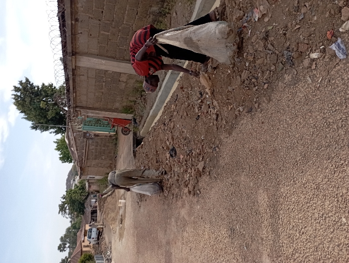 The image displays an outdoor scene in Jos, Nigeria, showing two individuals engaged in manual labor along a reddish-brown, gravel-surfaced road. On the right, a person wearing a red and black striped shirt, black trousers, and a red cap is bent forward, holding a large white sack with their right hand, appearing to collect debris from a mound of dirt, rocks, and refuse adjacent to a newly constructed concrete gutter. Further left and back, a second individual in light-colored clothing is also bent over, holding a white sack and collecting material from a similar pile of earth and debris. In the distant background, a third person stands near a white pickup truck on the road. The immediate environment includes sections of excavated earth, piles of sand, and a prominent concrete block wall topped with razor wire running along the right side, featuring a green metal gate and a red wheelbarrow. Scattered plastic waste is visible on the ground. Various single-story residential buildings and trees are visible in the background under a partially cloudy sky.