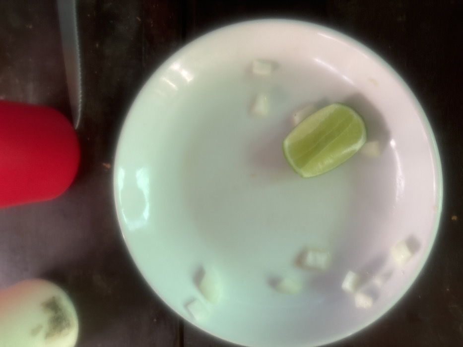 A high-angle, close-up image depicts a white, circular ceramic plate resting on a dark wooden table surface in Vang Vieng, Laos. On the plate, one bright green lime wedge is positioned in the lower right quadrant. Scattered across the plate are approximately ten small, cuboid white pieces, consistent with chopped onion or garlic. In the upper left background, a portion of a white or light-colored container with dark smudges is visible. To the upper right of the plate, a red, opaque cup is present. A serrated knife blade, with a dark handle partially visible, rests horizontally on the table surface behind the red cup. No individuals are depicted, and no specific actions or interactions are occurring.