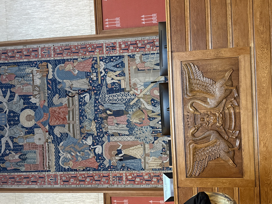 The image depicts a scene from the Oslo City Hall (Oslo Rådhus) in Oslo, Norway, likely within the City Council Chamber. The dominant feature is a large, intricate tapestry, spanning the full height of the visible wall, with a blue background and a red patterned border. The tapestry illustrates various allegorical and historical scenes related to Oslo. At the top, a haloed figure (Christ) sits centrally, surrounded by other figures and celestial elements. Below, scenes include a city skyline with buildings, ships on water, people in period attire, and white swans. Further down, there are depictions of daily life and labor, including individuals constructing buildings with scaffolding and cranes, farming activities, and social gatherings. The tapestry utilizes a distinct illustrative style with muted but rich colors. Below the tapestry, a substantial wooden desk or dais, crafted from light-colored wood, occupies the foreground. The central panel of this desk features a prominent, detailed carving: two swans facing each other, supporting a crowned shield containing a seated figure, which represents the Coat of Arms of Oslo. Two black computer monitors and associated microphones are positioned on the wooden surface of the desk. To the right of the tapestry, a red wall section is visible, adorned with a repeating pattern of white arrows. The wall surfaces flanking the tapestry appear light-colored with a subtle vertical texture. A partial view of a person, identifiable by a dark sleeve, is present on the far left.