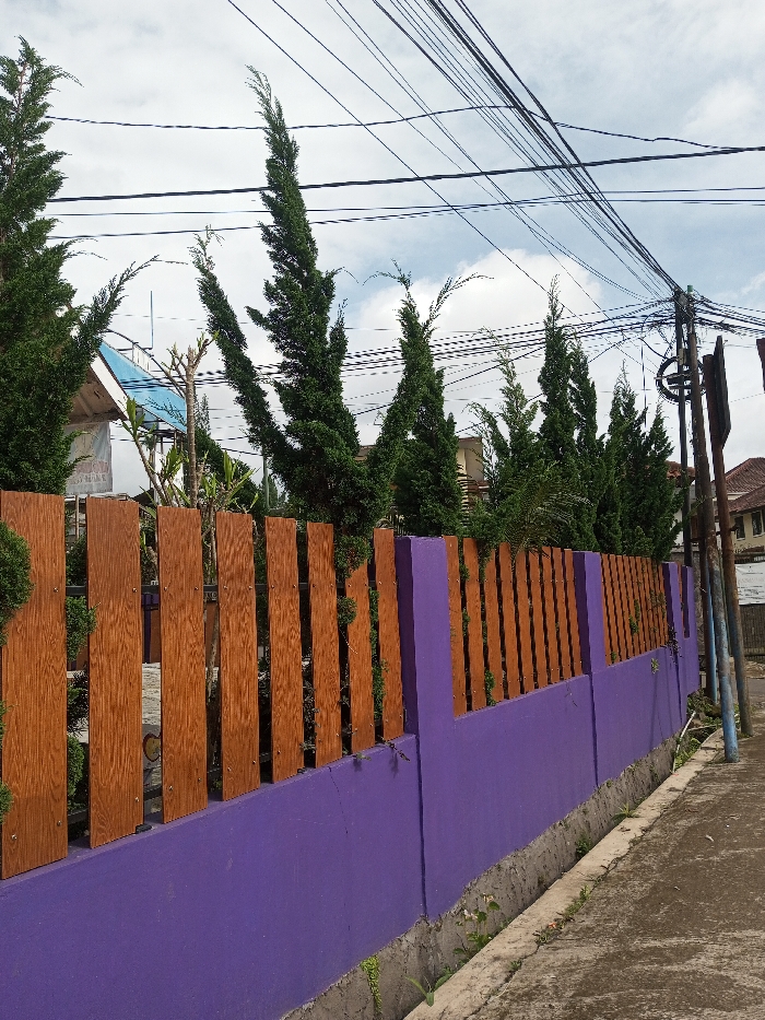 A purple wall with brown wooden planks atop creates a fence lining a gray sidewalk. Tall, slender evergreen trees grow behind the fence. Overhead, multiple power lines crisscross against a cloudy sky. A utility pole stands on the right side of the image, and parts of houses are visible in the background. Small weeds grow at the base of the wall.