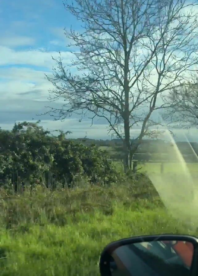 A video shot from inside a car depicts a roadside view of a grassy field under a sky of wispy clouds