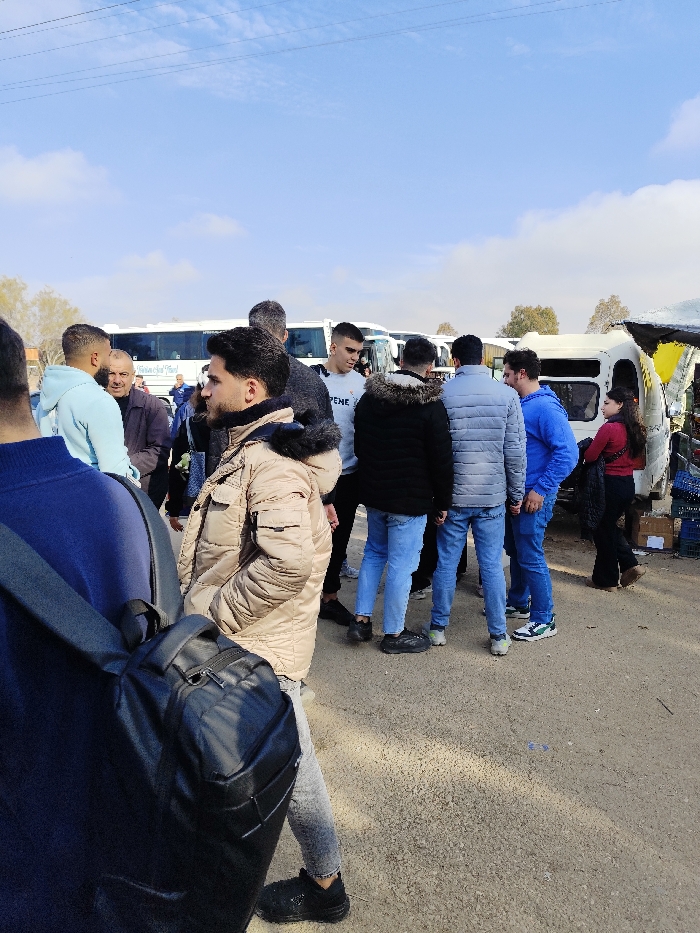 This image depicts an outdoor gathering of approximately twelve individuals on what appears to be a paved or dirt lot in Jibb as-Safa, Syria, under a clear blue sky with scattered clouds. The scene is illuminated by natural daylight. In the foreground, the back of an individual wearing a dark blue top and a black backpack is visible on the left. In the midground, a young man with dark hair, wearing a beige puffer jacket with a fur-lined hood, gray trousers, and black sneakers, stands facing right, with his hands in his pockets. To his left, another young man in a light blue hoodie and an older man in a dark jacket are partially visible, conversing. Further into the midground, a group of at least five men are clustered, two of whom are distinguishable: one in a gray puffer jacket and blue jeans facing away, and another in a blue hoodie and jeans, facing right. Another man in a white long-sleeved shirt with "REME" visible is also part of this group. To the far right, a white utility van with its rear cargo door open is parked, revealing contents or merchandise, possibly blue crates, at its base. A woman in a red long-sleeved top and dark pants is standing near the open rear of the van, facing inward. In the background, multiple large white passenger buses are parked. One bus prominently displays partial text that appears to be "Miriam ... Tours" on its side. Sparse trees are visible on the horizon to the left. The ground is a light-colored, uneven surface.