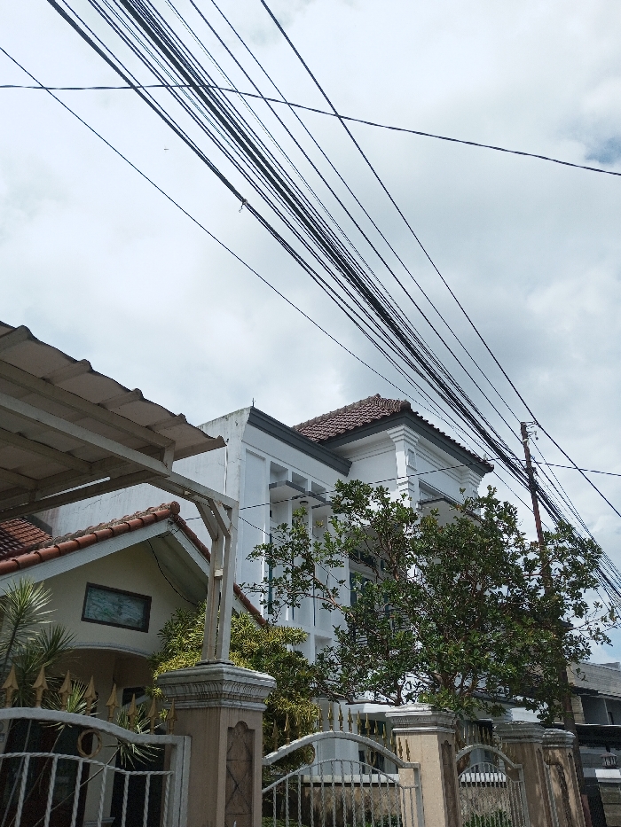 A low-angle shot of suburban architecture under a cloudy sky dominated by a thick network of overhead power lines. The image focuses on two houses, one with a tiled roof and the other a taller white building with a decorative facade. Lush greenery partially obscures the buildings, with a wrought-iron fence in the foreground suggesting a property boundary. The overall impression is of a neighborhood scene, with a slight emphasis on the clutter of urban utilities.