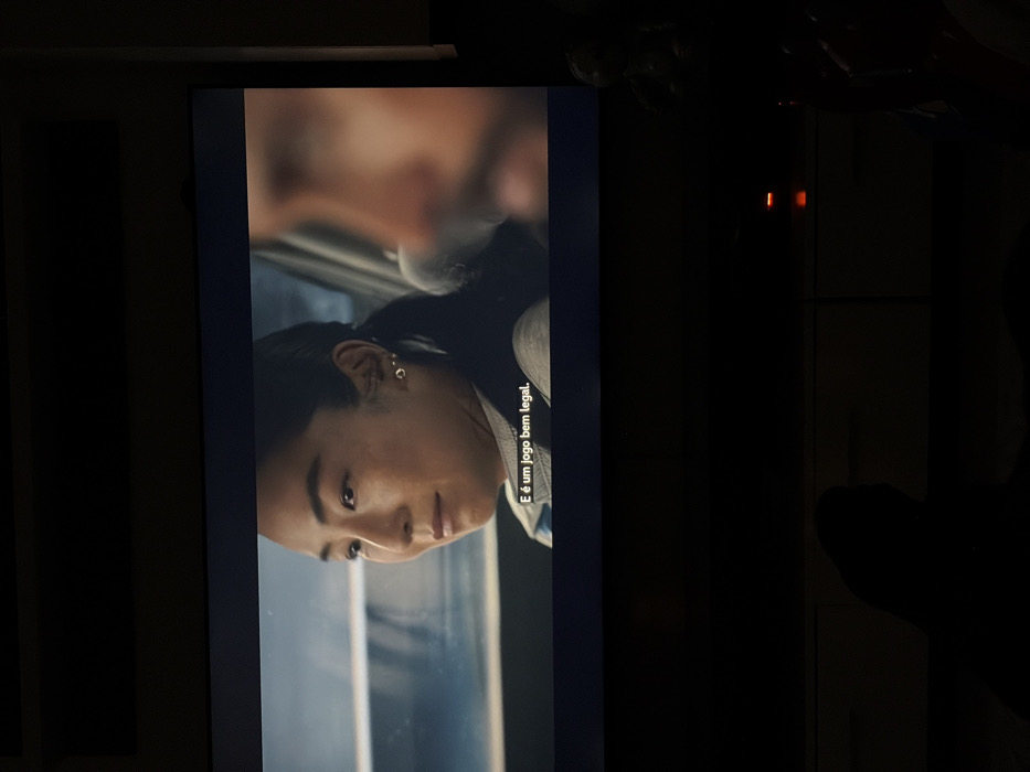 A television screen displays a close-up of a woman with dark hair pulled back, an earring visible in her ear. She is looking down and to the left, appearing pensive. Above her is a blurred image of another person. Subtitles in Portuguese read, "É é um jogo bem legal." The rest of the scene is dark, with outlines of objects discernible in the background.