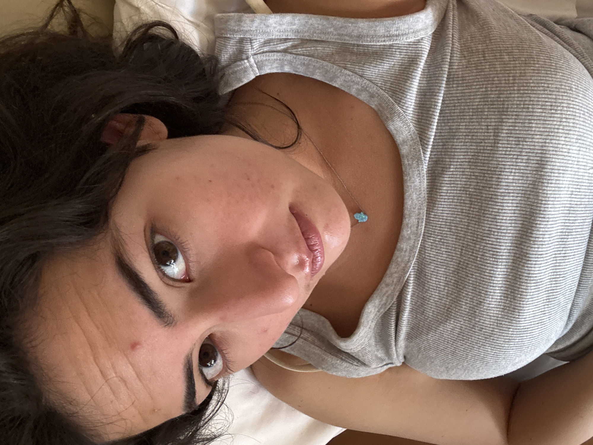 A woman lies on a white surface, possibly a bed. She has dark hair and brown eyes, and wears a light grey striped shirt. A necklace with a blue pendant is visible on her chest. The background is blurred, providing no clear location information. The image provides no indication of a location in the city of Puebla, Mexico.
