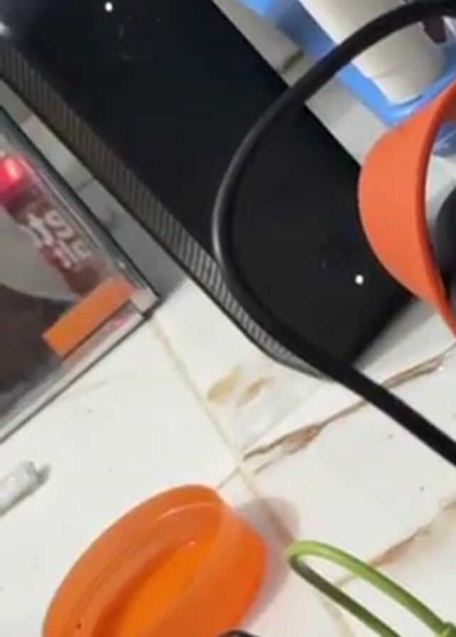 A slightly high-angle, close-up shot shows a cluttered surface covered with white square tiles. Dominating the frame is a black, rectangular device with a carbon fiber design along the side, featuring two small white lights on its surface. To the right of the device, an orange wristband rests. Below the device and to the left, there's an orange container filled with liquid. A small mirror reflecting a bottle of liquid is positioned further to the left. A black cord snakes through the scene. Additional items, including a green cable, white toothpaste tube, and pieces of paper, contribute to the overall cluttered appearance. No people are clearly visible.