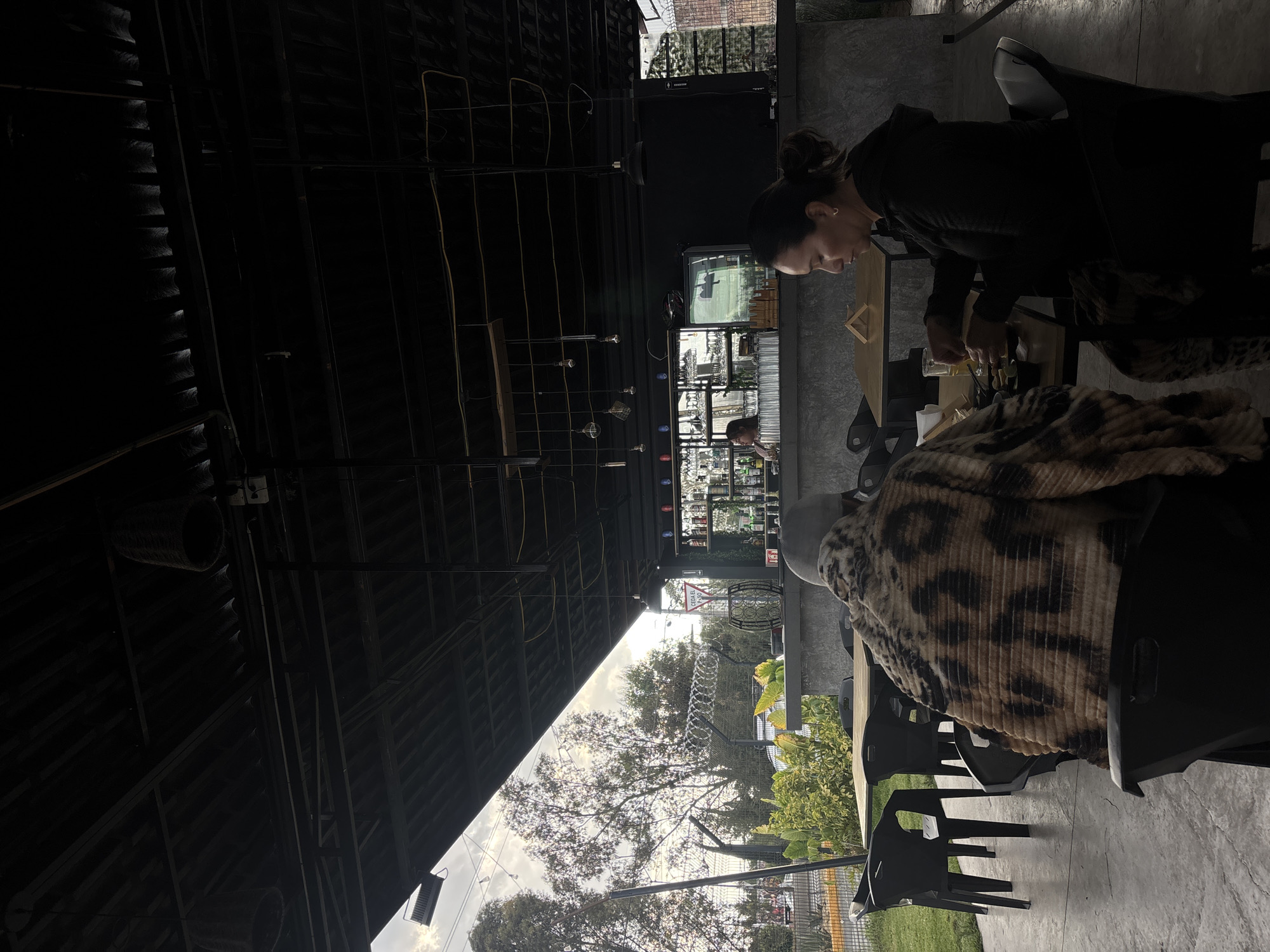 Here's a forensic description of the image: **Location:** An open-air restaurant or bar in San Pedro Cholula, Mexico. The roof is metal sheeting on a steel frame. Beyond a wall are trees and greenery. A glimpse of a street is visible. **People:** A woman with her hair in a bun leans over a table. She is wearing a dark jacket and appears to be preparing a drink. The back of another person is visible, seated at the table and wearing an animal print jacket. Another person is visible behind the bar. **Objects:** There is a bar visible in the background, with a back bar of bottles. The table in the foreground has various items on it for making drinks. There are chairs around the table. There is a Samsung TV mounted to the wall. **Actions:** The woman is actively making a drink, pouring liquid from one container to another. **Interactions:** Two people are seated together at a table, with one preparing a drink. **Environment:** The environment is a combination of indoor and outdoor space, with natural light filtering in through the partially open roof and through an adjacent opening that leads to a green space.