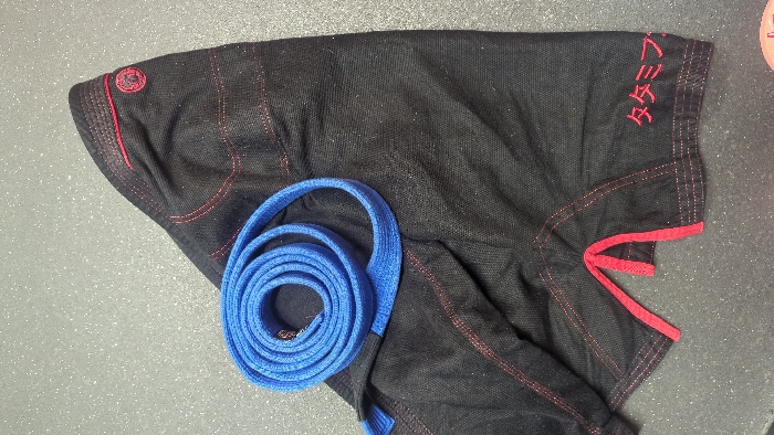 - "The image displays a folded black martial arts Gi top and a coiled blue belt resting on a dark gray, speckled surface" by FM-LTQbm2, licensed under CC BY 4.0