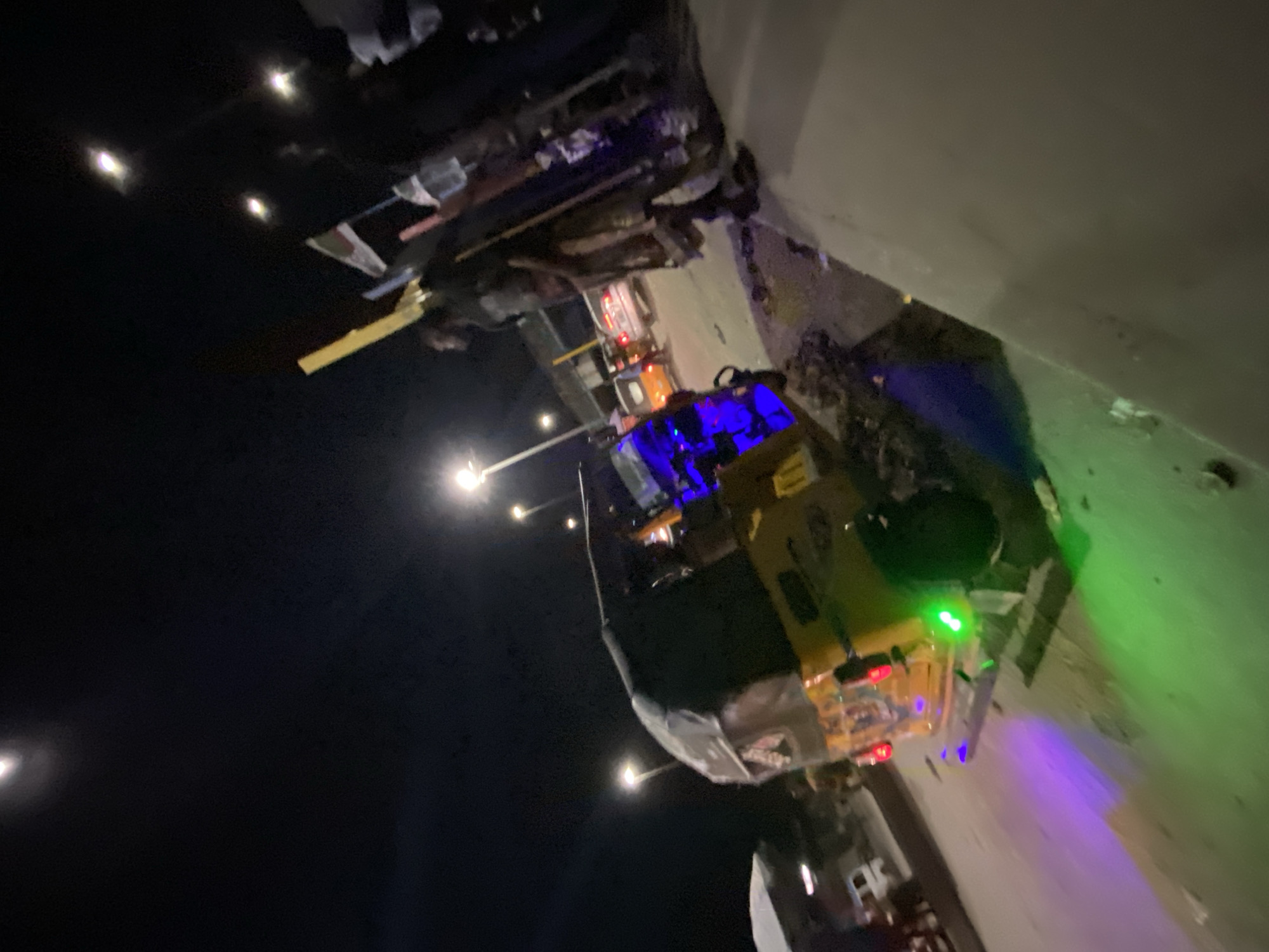 The image is captured at night in Lekki, Nigeria. Streetlights illuminate the scene, where a yellow-colored auto-rickshaw is decorated with blue and green lights. The rickshaw appears to be parked near a wall. People are present near the rickshaw and around other vehicles parked nearby. Decorations, possibly flags or banners, are suspended above the scene. The environment includes a paved surface, and the image quality suggests it was taken with a mobile phone camera.