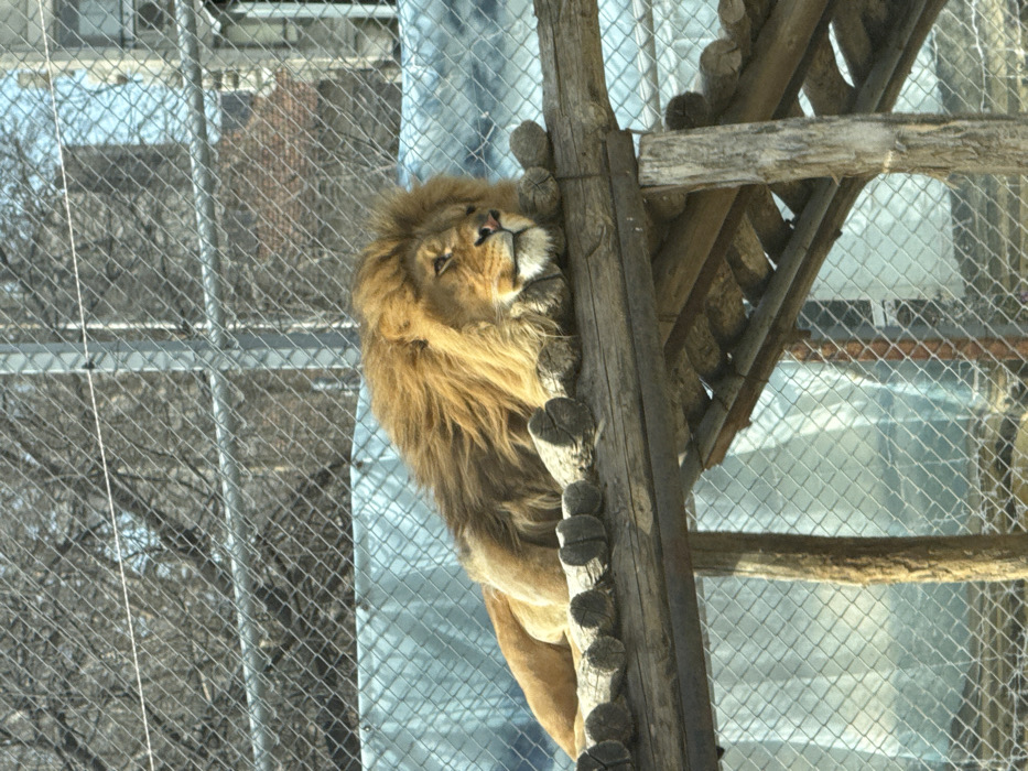 A male lion with a prominent reddish-brown mane is depicted lying on a raised wooden platform composed of rough-hewn logs